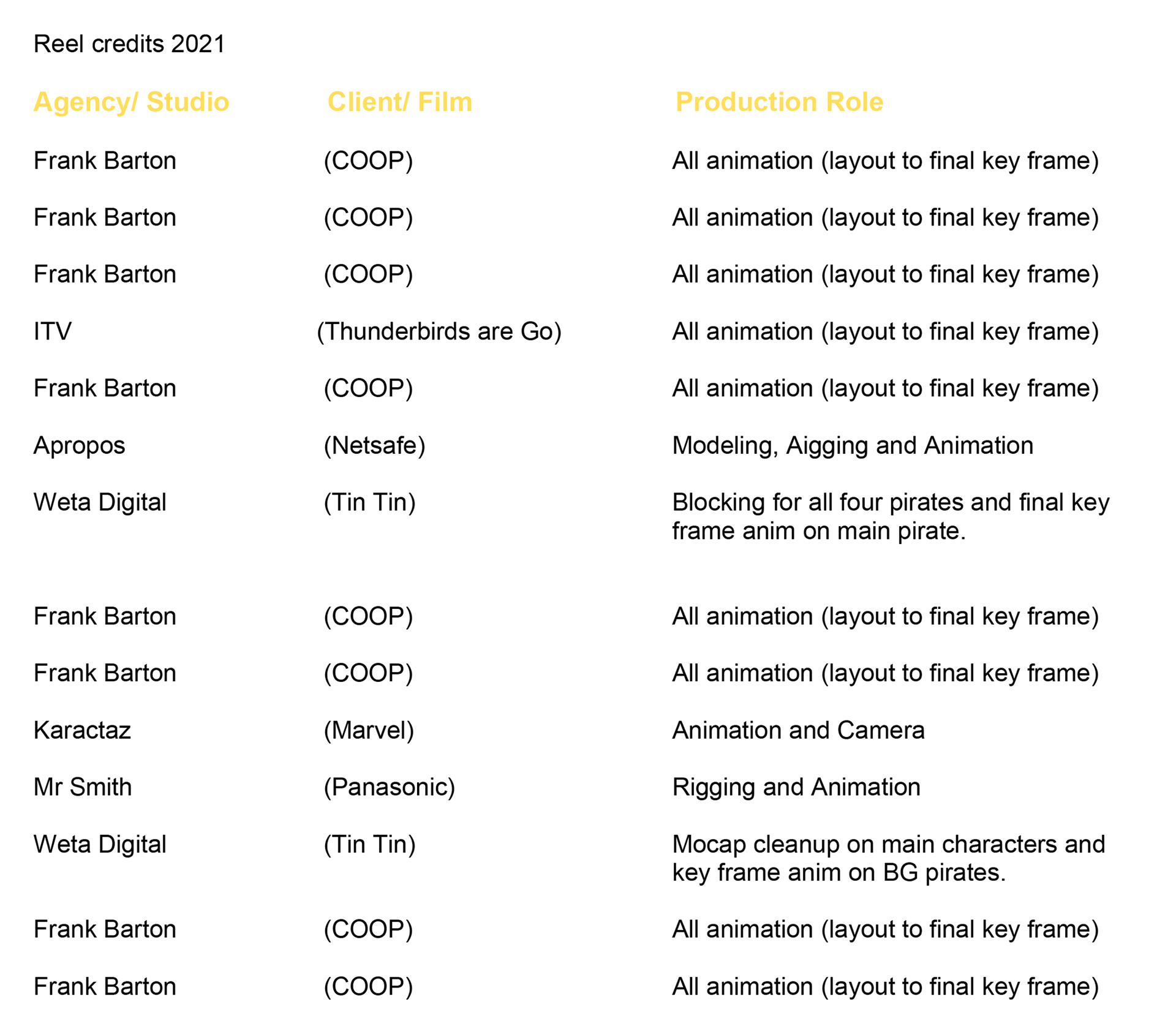 Credit list for my 3D reel